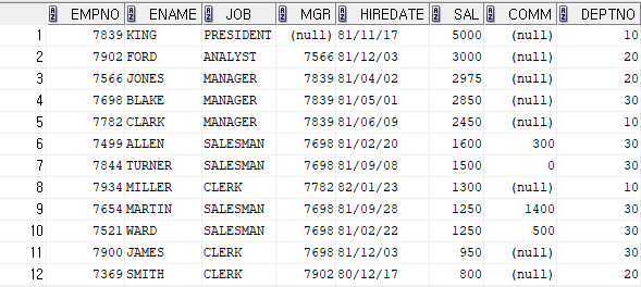 ์นํ๋ณ์์ ๋ํด์ ์์๋ณด๊ธฐ ์ํด Oracle์ scott ๊ณ์ ์์ ์๋ EMP ํ ์ด๋ธ์ ๊ฐ๊ณ ์ค์ตํด ๋ณด๊ฒ ์ต๋๋ค.