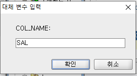 COL_NAME์ด๋ผ๋ ์นํ๋ณ์๋ฅด ์นผ๋ผ๋ช ์ผ๋ก ์ฌ์ฉํด๋ดค์ต๋๋ค. SAL ์นผ๋ผ์ ์ ๋ณด๋ฅผ ๋ณด๊ธฐ ์ํด ์ ๋ ฅ์ฐฝ์ SAL์ ์ ๋ ฅํ๋๋ ์ด์์์ด ํด๋น ์ด์ ์ ๋ณด๋ฅผ ์ถ๋ ฅํ ์ ์์์ต๋๋ค.