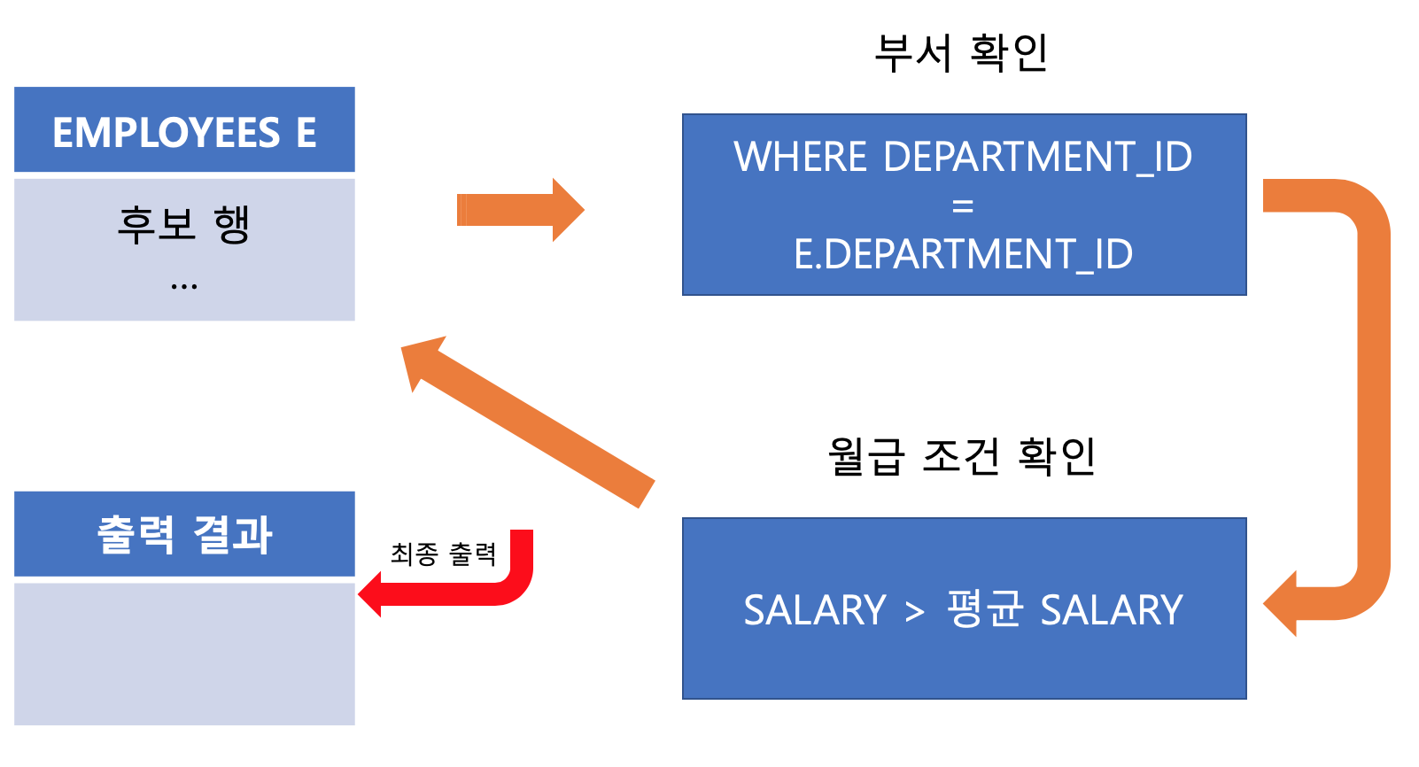 2๋จ๊ณ. Subquery์์ ์ป์ ๋ถ์์ ํ๊ท ๊ธ์ฌ ๊ฐ๊ณผ Main Query์ ์ฒซ๋ฒ์งธ ๊ฐ์ ๋น๊ตํ์ฌ ํด๋น ํ์ ์ถ๋ ฅ์ ํฌํจ์ํฌ์ง ์ ํฉ๋๋ค.