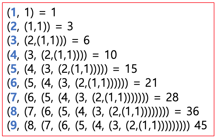 ์ฐ์๋ ์์ ํฉ์ ๊ทธ๋ฆผ์ผ๋ก ํํํด๋ดค์ต๋๋ค. ์ธ์๋ก 1๊ณผ 9๊ฐ ๋ค์ด๊ฐ๋ฉด 1๋ถํฐ 9๊น์ง ๋ชจ๋ ์ซ์๋ฅผ ๋ํด์ 45๋ผ๋ ๊ฒฐ๊ณผ๋ฅผ ์ถ๋ ฅํฉ๋๋ค. ์ด ์๊ณ ๋ฆฌ์ฆ์ ์ฌ๊ทํจ์์์ผ๋ก ํํํ๋ฉด ์๋์ ๊ฐ์ต๋๋ค.