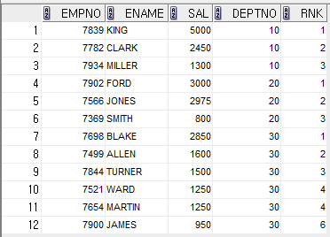 ,RANK() OVER(PARTITION BY DEPTNO ORDER BY SAL DESC) AS RNK