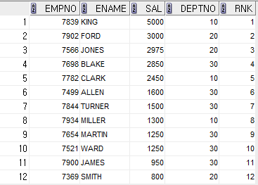 ,ROW_NUMBER() OVER(ORDER BY SAL DESC) AS RNK