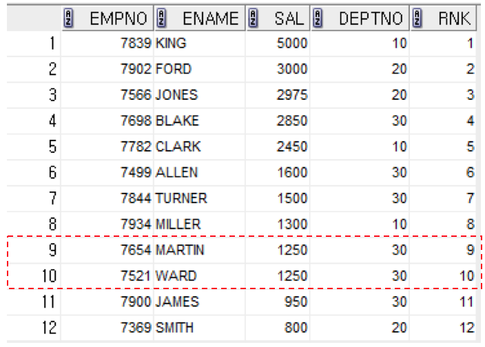 ,DENSE_RANK() OVER(ORDER BY SAL DESC) AS D_RANK