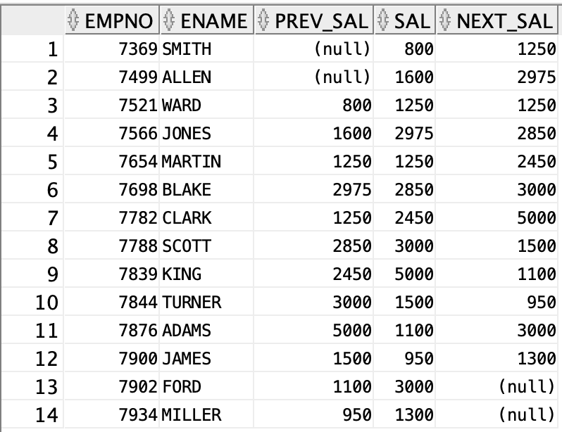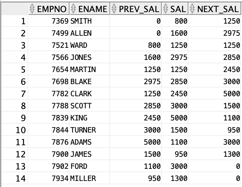 ,LAG(SAL) OVER(ORDER BY EMPNO) AS PREV_SAL
