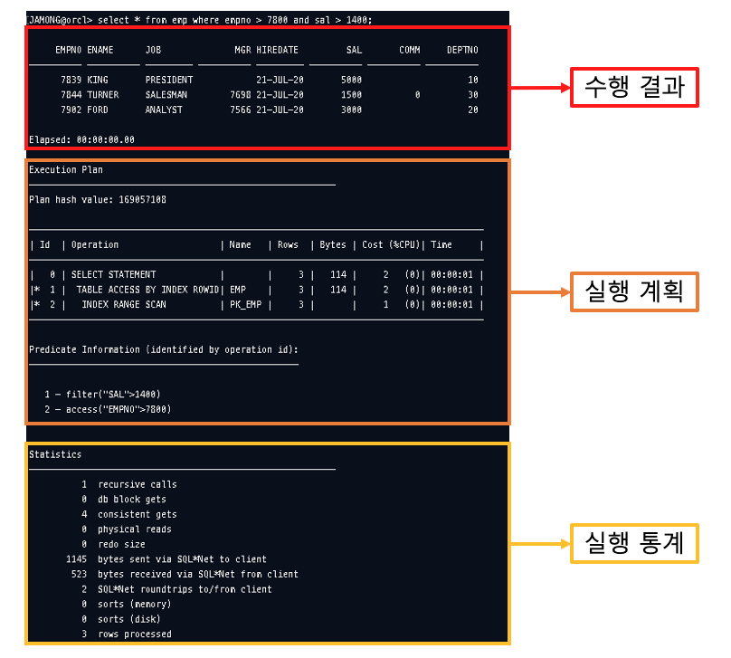 | ๋ช ๋ น | ์ํ ๊ฒฐ๊ณผ | ์คํ ๊ณํ | ์คํ ํต๊ณ | plustrace ๊ถํ ์ฌ๋ถ |