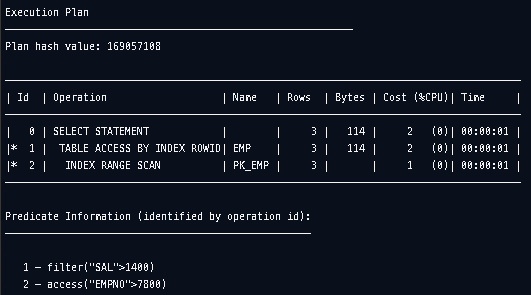 explain plan ๋ช ๋ น์ด๋ฅผ ์ฌ์ฉํด์ ์คํ๊ณํ์ ํ์ธํ ์ ์์ต๋๋ค. explain plan ๋ช ๋ น์ ์ฌ์ฉํ๋ฉด ์ค์ต ์ค๋น์์ ์์ฑํ plan_table์ ์คํ๊ณํ์ ๋ด์ต๋๋ค. ์ดํ ์ค๋ผํด์์ ์ ๊ณตํ๋ utlxpls ์คํฌ๋ฆฝํธ๋ฅผ ์ด์ฉํด์ ํ์ธํ๊ธฐ ํธ์ํ ํํ๋ก ์คํ๊ณํ์ ์ถ๋ ฅํ ์ ์์ต๋๋ค.