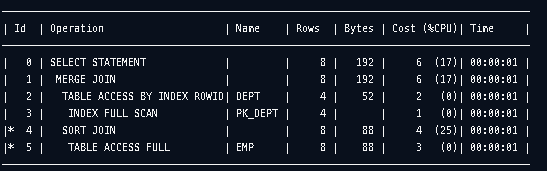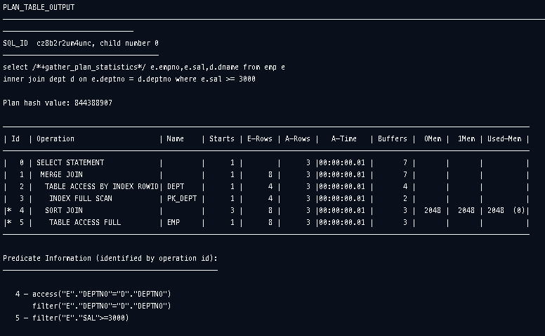 JAMONG@orcl> select /*+gather_plan_statistics*/ e.empno,e.sal,d.dname from emp e inner join dept d on e.deptno = d.deptno where e.sal >= 3000;