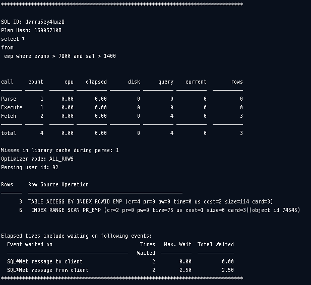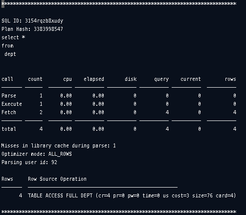 Traceํ์ผ์ ์ง์ ์ด์ด๋ณด๋ฉด ์๊ธฐ ํ๋ ํํ๋ก ๋์ด์์ต๋๋ค. ์ค๋ผํด์์ ์ ๊ณตํ๋ tkprof ์ ํธ๋ฆฌํฐ๋ฅผ ์ฌ์ฉํด์ ์ฌ์ฉ์๊ฐ ๋ณด๊ธฐ ํธํ ํํ๋ก ๋ถ์๊ฒฐ๊ณผ๋ฅผ ์ถ๋ ฅํด์ค๋๋ค.
