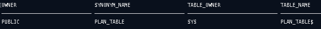 SQL์ ๋ํ ์คํ๊ณํ์ด plan_table์ ์ ์ฅ๋ฉ๋๋ค. oracle 10g ๋ถํฐ๋ ์ค์น์ ๊ธฐ๋ณธ์ ์ผ๋ก ํ ์ด๋ธ์ด ์์ฑ๋๊ณ ์ด๋ฅผ ๊ฐ๋ฅดํค๋ plan_table synonym์ด ์์ฑ๋ฉ๋๋ค. ๋ง์ฝ ํด๋น synonym์ด ์๋ค๋ฉด ์ค๋ผํด์์ ์ ๊ณตํ๋ ์คํฌ๋ฆฝํธ๋ฅผ ์คํํด์ ์์ฑํ ์ ์์ต๋๋ค. ์์ ์ ์๋ ๋ช ๋ น์ผ๋ก ์์ฑ๊ฐ๋ฅํฉ๋๋ค.