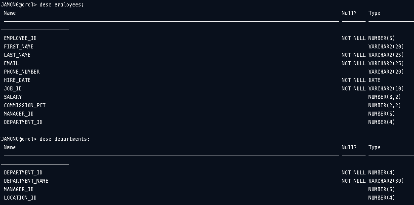 SYS@orcl> create table jamong.departments as select * from hr.departments;