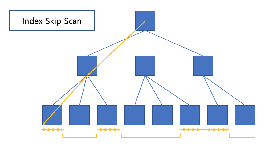 Index Skip Scanμ Multi Column Indexμμ νν μΉΌλΌμ 쑰건μ μ μ¬μ©ν λ νμ©ν μ μμ΅λλ€. μ±λ³μ²λΌ μ λ μΉΌλΌμ κ³ μ κ°μ κ°μκ° μ κ³ νν μΉΌλΌμ κ³ μ κ°μ΄ λ§μ λ ν¨κ³Όμ μ λλ€. μλ₯Ό λ€μ΄ λΆμκ° 10,20,30,40 μΈ νμ¬κ° μλλ° μ§μμ΄ 1000λͺ μ λλ€. κ°κ° 500,100,200,200 λͺ μ μ§μμ΄ μμ΅λλ€. μ°λ¦¬κ° μκ³ μΆμ λ΄μ©μ κΈμ¬κ° 5000 ~ 7000 μ¬μ΄μΈ μ§μμ λλ€. μμ±λ μΈλ±λ (λΆμλ²νΈ,κΈμ¬)λ‘ κ²°ν©λ μΈλ±μ€κ° μμ΅λλ€. λ§μ½ Index Skip Scanμ μ¬μ©νλ©΄ 10λ² λΆμμμ 5000 ~ 7000μΈ μ§μμ μ°Ύκ³ κ·Έ μ΄ν 10λ² λΆμμ λ°μ΄ν°λ νμΈν νμκ° μκΈ° λλ¬Έμ 20λ² λΆμλ‘ λμ΄κ°μ λκ°μ΄ λ°λ³΅ν©λλ€. μ΄λ°μμΌλ‘ νμμλ λΆλΆμ λν΄μ 건λλ΄λ€λ©΄ Full Table Scanλ³΄λ€ μ±λ₯μ΄ μ’μ μ μμ΅λλ€.