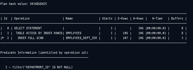 department_idμ λ€μ μΈλ±μ€λ₯Ό μμ±νμ΅λλ€. μ°μ 쑰건μ μ range scanμ νΌνκΈ° μν΄ is not null 쑰건μ λΆμ¬νμ΅λλ€. κ·Έλ¦¬κ³ department_idλ₯Ό κΈ°μ€μΌλ‘ μ λ ¬νλ μμ μ νμ΅λλ€. μ΄λ² μμλ μ λ ¬μμ μ μλ΅νκΈ° μν΄ Index Full Scanμ μ¬μ©ν κ² μ λλ€. is not null μ‘°κ±΄μ΄ μλλλΌλ Full Scanμ μ¬μ©ν μ μμ΅λλ€. νμ§λ§ μ΄λ² μμμμλ λ¨μΌ μΉΌλΌ μΈλ±μ€λ₯Ό μ¬μ©νκΈ° λλ¬Έμ 쑰건μ λΆμ¬νλ©΄ Range ScanμΌλ‘ νμνκΈ° λλ¬Έμ not null 쑰건μ μ¬μ©νμ΅λλ€. μ΄λ° μμΌλ‘ μ λ ¬μμ μ μλ΅νκΈ° μν΄ λ§μ΄ μ¬μ©λ©λλ€.