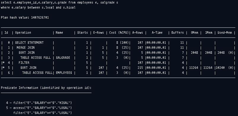 ๊ธ์ฌ๋ณ ๋ฑ๊ธ์ ๋๋๋ ํ ์ด๋ธ salgrade๋ฅผ ์์ฑํ๊ณ ์ง์์ ๋ฑ๊ธ์ ๊ฐ์ด ์ถ๋ ฅํ๋ non equi join ์ฟผ๋ฆฌ๋ฅผ ์คํํด๋ดค์ต๋๋ค. ์ ํ ์ด๋ธ์ ์ ๋ ฌํ๊ณ sort merge join์ ์ตํฐ๋ง์ด์ ๊ฐ ํํ๊ฒ์ ํ์ธํ ์ ์์ต๋๋ค. ์กฐ์ธ ์กฐ๊ฑด์ ๋ง๋ ๋ฒ์์ ๋ํด ํํฐํ Inner table์ ๊ฐ๊ฐ ์ก๋ ฌ๋ ์ํ๋ก Outer Table๋ก๋ถํฐ ์์ฐจ์ ์ผ๋ก ์ฝ์ด non equi join์ ํ๋๋ฐ ์ ๋ฆฌํ ์ ์์ต๋๋ค.