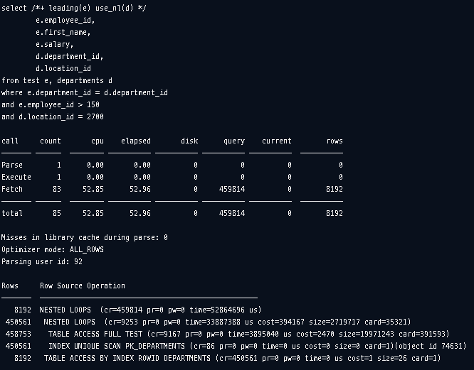 select /*+ leading(d) use_nl(e) */