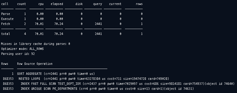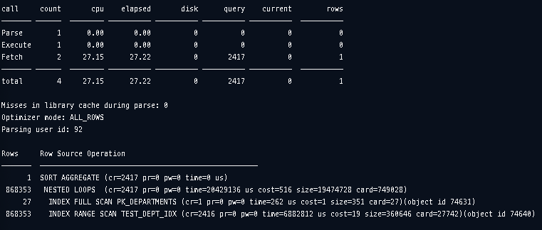 HR ๊ณ์ ์ ๊ธฐ๋ณธ ํ ์ด๋ธ์ ๋ฐ์ดํฐ๋ฅผ jamong ๊ณ์ ์ผ๋ก ์ด๋ํ์ฌ ์ฌ์ฉํ๊ณ , ์ปค์์ ์กด์ฌํ๋ ์คํ๊ณํ์ ์์๋ก ํ์ธํ๊ธฐ ์ํด statistics_level์ all๋ก ์ค์ ํ์ต๋๋ค. test table์ department_id์ ๋ํ ์ธ๋ฑ์ค๋ ์์ฑํด์ค๋๋ค.