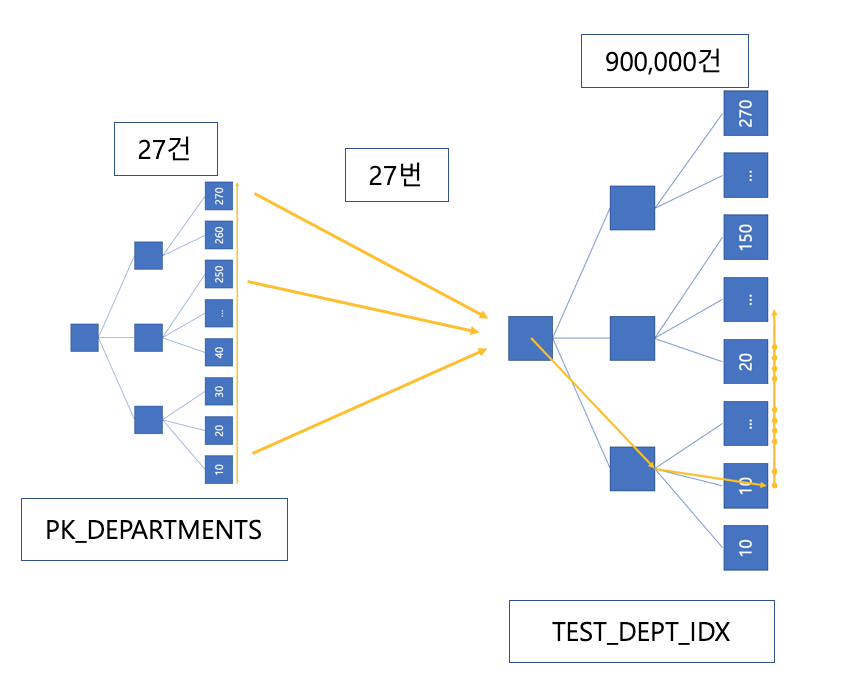 driving ํ ์ด๋ธ์ด departments์ผ๋๋ ๋ ์ฝ๋๋ฅผ PK_DEPARTMENTS์์ ๋จผ์ ๋ค ํ์ธํ๊ณ ๊ฐ ๋ ์ฝ๋๋ณ๋ก Range Scan์ ํตํด TEST_DEPT_IDX๋ฅผ ํ์ํฉ๋๋ค. ์๋์ ๊ฐ์ ์์ผ๋ก ์ํํฉ๋๋ค.