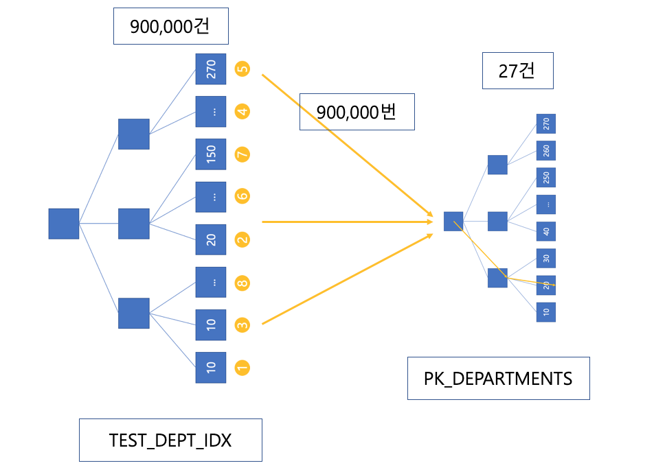 driving ํ ์ด๋ธ์ด test์ผ๋์ ์ํฉ์ ๋จผ์ ๋ณด๊ฒ ์ต๋๋ค. ๋ ์ฝ๋ ํ๋์ฉ ํ์ธํ๊ธฐ ๋๋ฌธ์ ๋จผ์ TEST_DEPT_IDX๋ฅผ ๊ฐ๊ฐ 90๋ง๋ฒ ํ์ธํ๋ฉด์ PK_DEPARTMENTS ์ธ๋ฑ์ค๋ฅผ Unique Scan์ผ๋ก ํ๋ฒ์ฉ๋ง ํ์ธํ์ฌ ๊ฒฐ๊ณผ๋ฅผ ๋ฐ์์ต๋๋ค. ๊ทธ๋ฆผ์ผ๋ก ํํํ์๋ฉด ์๋์๊ฐ์ด ๋ป์ด๋๊ฐ๋ฉด์ ๋ฐ์ดํฐ๋ฅผ ์กฐ์ธํฉ๋๋ค.