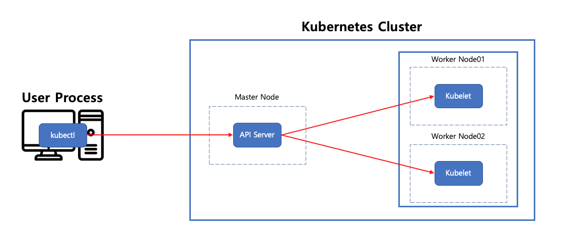 Kubernetes ํด๋ผ์ด์ธํธ๋ฅผ ์ด์ฉํด์ Kubernetes Cluster์ API Server๊ณผ ํต์ ํ๊ณ ํด๋ฌ์คํฐ ๋ด์ API Server๋ Worker Node์ ํต์ ํ์ฌ ์ปจํ ์ด๋๋ฅผ ๊ด๋ฆฌํ๋ค.