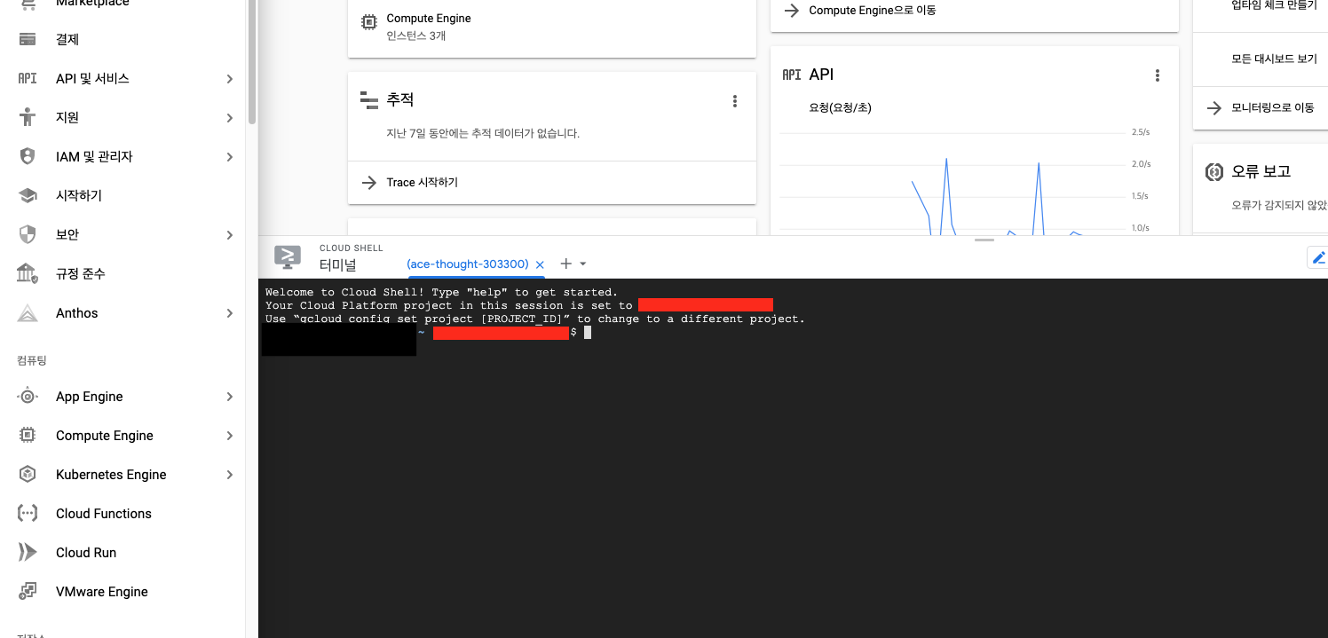 ์ด๋ ๊ฒ web interface ์์ผ๋ก ์์ฑํ๊ณ ๊ด๋ฆฌํ ์ ์๋ ๋ฐฉ๋ฒ์ด ์๊ณ ... minukube์์ ์ฒ๋ผ CLI ํํ๋ก ์์ฑํ๊ณ ์ ์ดํ ์ ์๋ ๋ฐฉ๋ฒ์ด์๋ค. ๊ทธ๋ฌ๊ธฐ ์ํด์๋ ๊ตฌ๊ธ ํด๋ผ์ฐ๋ Shell์ ์ฌ์ฉํด๋ณด์.