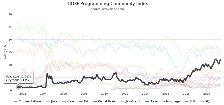 2021๋ 05์๋ฌ์ ๊ธฐ์ค์ผ๋ก PYPL, TIOBE ์ธ๋ฑ์ค์ ๊ฐ๊ฐ 1, 2์๋ฅผ Python์ด ํ๊ณ ์์ต๋๋ค. ์ฆ ์ง๊ธ ํ์ฌ ๊ฐ์ฅ ์ธ๊ธฐ ์๋ ๊ทธ๋ฆฌ๊ณ ์ฌ์ฉ๋ฅ ์ด ๊ฐ์ฅ ๋ง์ด ์ฑ์ฅํ๊ณ ์๋ ์ธ์ด๊ฐ ๋ฐ๋ก Python์ ๋๋ค. ๊ทธ๋ ๋ค๋ฉด ์ Python์ ์ฌ๋๋ค์ด ์ฌ์ฉํ๋ ค๋ ๊ฒ์ผ๊น์?