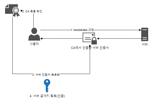 - ์ด ๋ ์๋ฒ์์๋ CA(๊ณต์ธ ์ธ์ฆ ๊ธฐ๊ด)์์ ์ธ์ฆ๋ฐ์ ์ธ์ฆ์(CA์ ๊ฐ์ธํค๋ก ์ํธํ๋ ์ ์ ์๋ช )๋ฅผ ํด๋ผ์ด์ธํธ๋ก ๋ณด๋ธ๋ค.